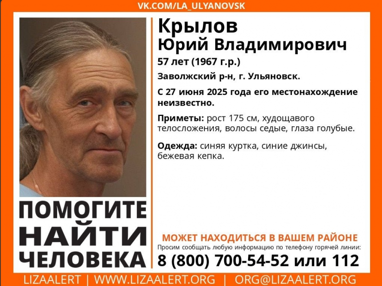 В Заволжском районе Ульяновска 27 июня пропал 57-летний местный житель Юрий Крылов.