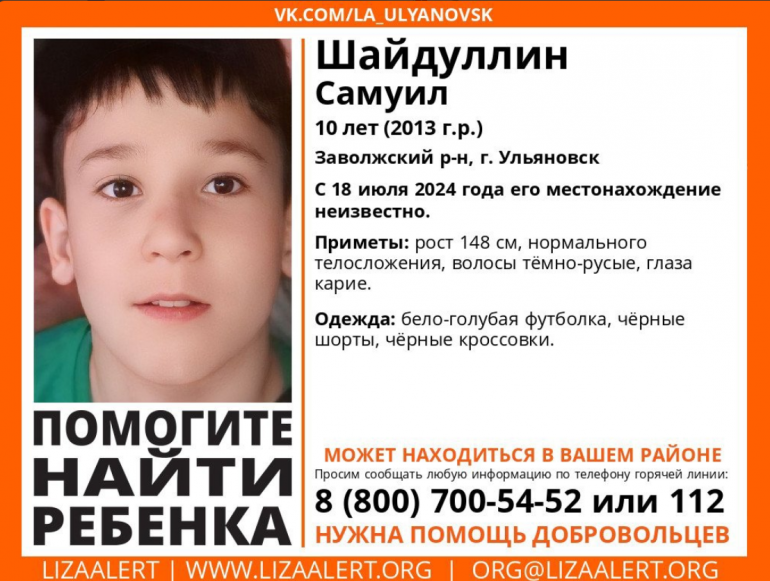 Вчера, 18 июля, в Заволжском районе Ульяновска пропал десятилетний мальчик Самуил Шайдуллин.