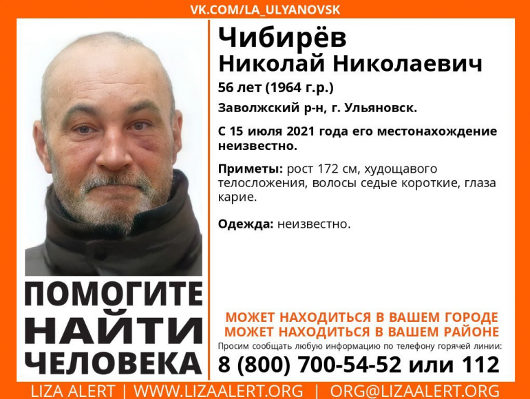 Волонтеры из поисково-спасательного отряда «Лиза Алерт» сообщают, что в Заволжском районе Ульяновска пропал 56-летний местный житель Николай Чибирёв.