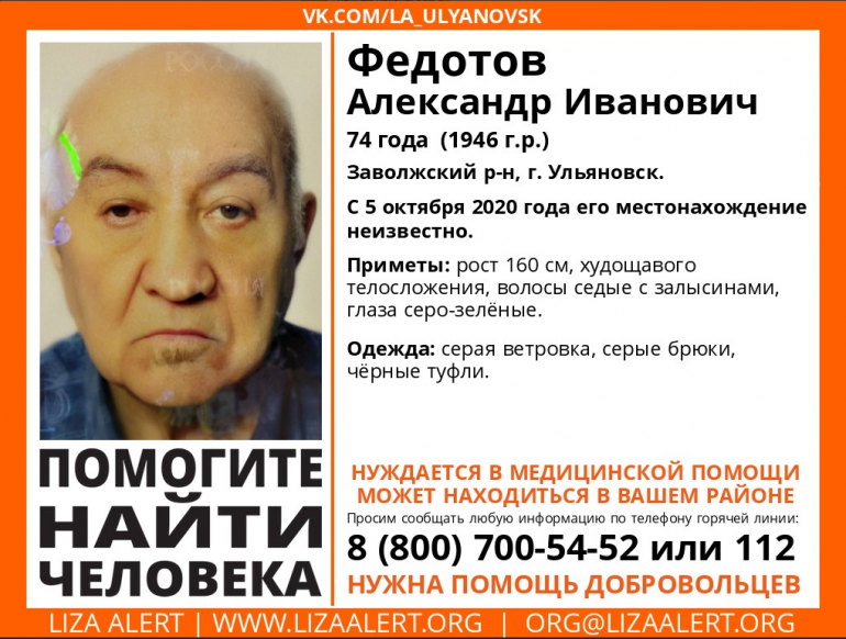В Заволжском районе Ульяновска пропал 74-летний местный житель Александр Федотов. Он ушел из дома 5 октября, и до сих пор его местонахождение неизвестно.