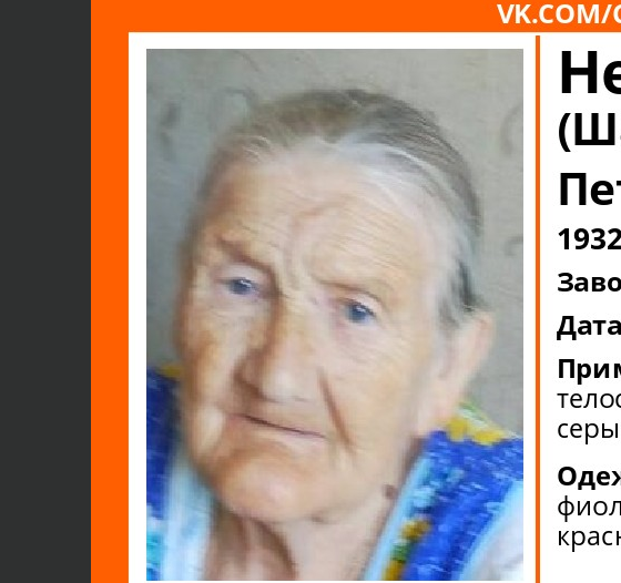 Сообщаются приметы пенсионерки: рост 150 см, худощавого телосложения, волосы седые короткие, глаза серые. Старушка была одета в коричневый плащ, фиолетовый в цветочек халат и красные домашние тапочки.