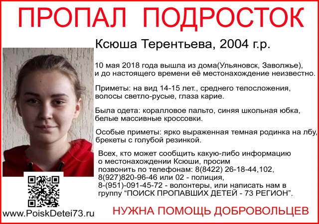 В соцсети появилось сообщение о пропаже 14-летней Ксюши Терентьевой – жительницы Заволжского района Ульяновска.