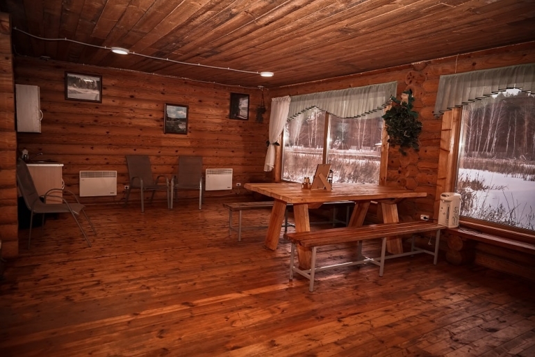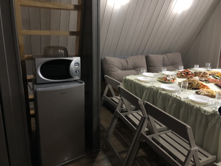 Что касается еды, то ограничений никаких нет. Можно всё привезти с собой, приготовить мясо на мангале (он установлен у каждого домика), также есть опция заказать доставку в домик. Сейчас доступна только пицца из печи, в ближайшее время расширят ассортимент — появятся пельмени, вареники и сырники. Кроме того, если компания от 10 человек берет в аренду домик или несколько на более чем двое суток, то можно поберечь силы хозяек и заказать трёхразовое питание. Завтрак, обед и ужин приготовят профессиональные повара, которые летом кормят ребят из детского лагеря по соседству. Стоимость трёх приемов пищи на одного человека в сутки — примерно 1500 рублей*.