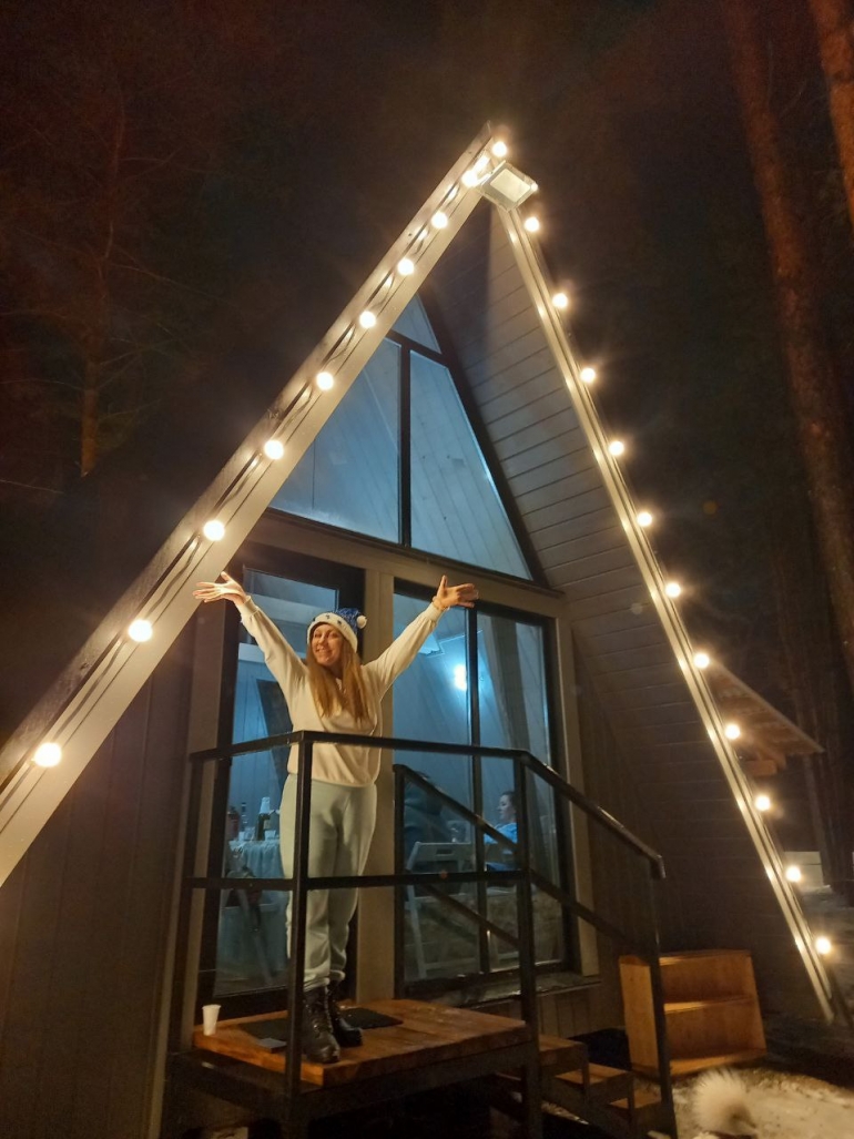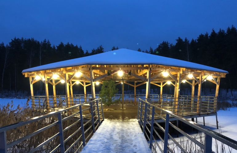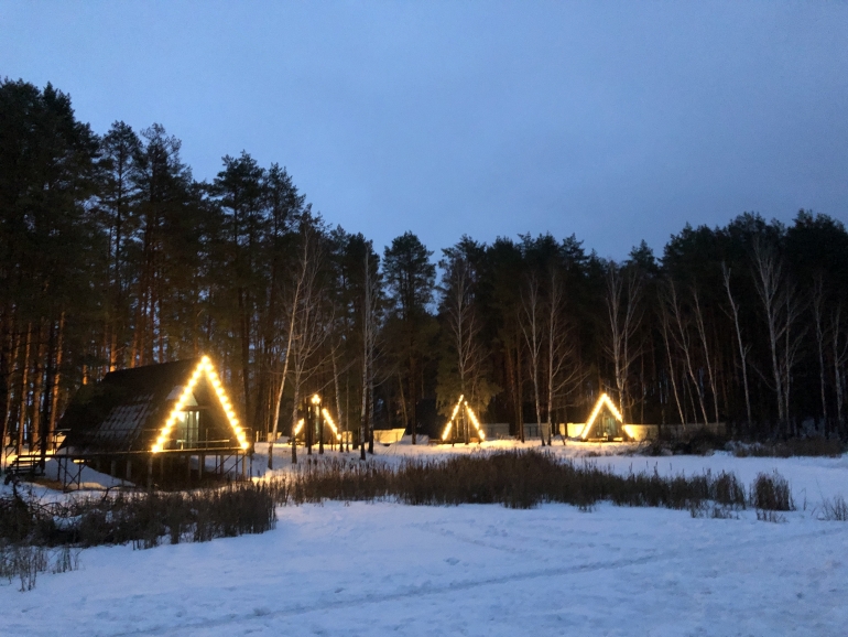 Вечером «Артеково» освещается фонариками на фасадах домов и гирляндами в беседке. Снег и лес погружают в сказочную предновогоднюю атмосферу.