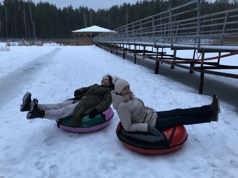 Из развлечений, помимо долгих снежных прогулок, — прокат тюбингов. Кататься на них можно на обустроенной ледяной горке, которая выходит прямо на гладь замёрзшего озера. Нашей редакцией доказано: даже один проезд на такой надувной «ватрушке» дарит позитивные эмоции и возвращает то самое детское ощущение праздника, которое у многих осталась только в воспоминаниях. Всего в туристической деревне восемь тюбингов, арендовать их можно за 300 рублей в час.