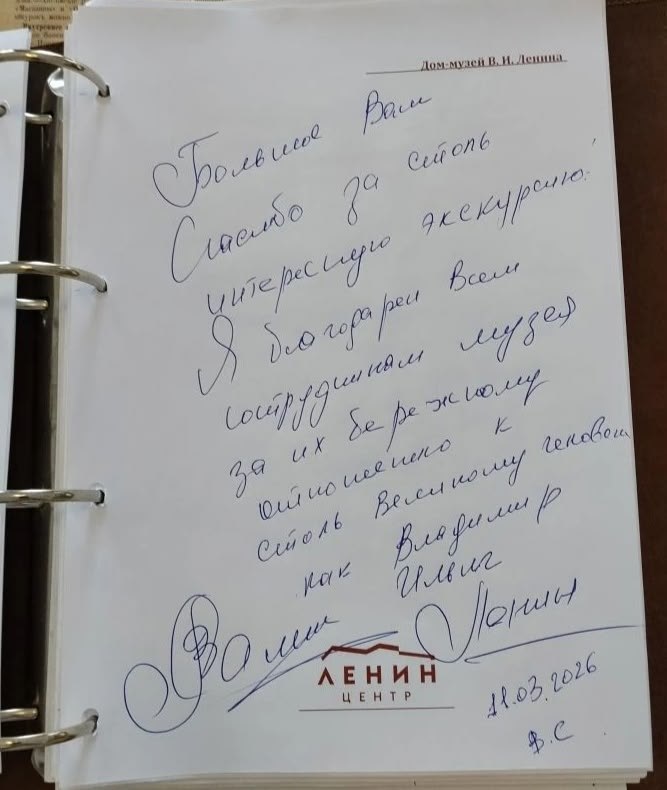 «Большое Вам спасибо за столь интересную экскурсию. Я благодарен всем сотрудникам музея за их бережное отношение к столь Великому человеку, как Владимир Ильич Ленин».