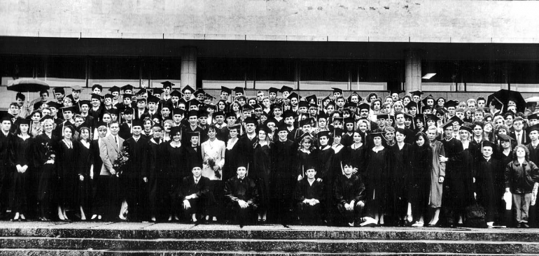 Выпускники ульяновского филиала МГУ у входа в Ленинский мемориал одними из первых в России облачаются в академические мантии и квадратные шапочки с кисточками, 1993 год