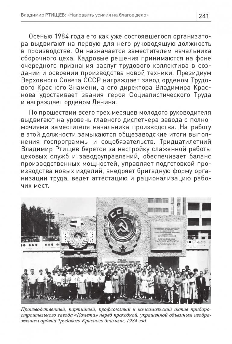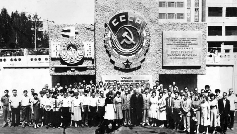 Производственный, партийный, профсоюзный и комсомольский актив приборостроительного завода «Комета» перед проходной, украшенной объемным изображением ордена Трудового Красного Знамени, 1984 год