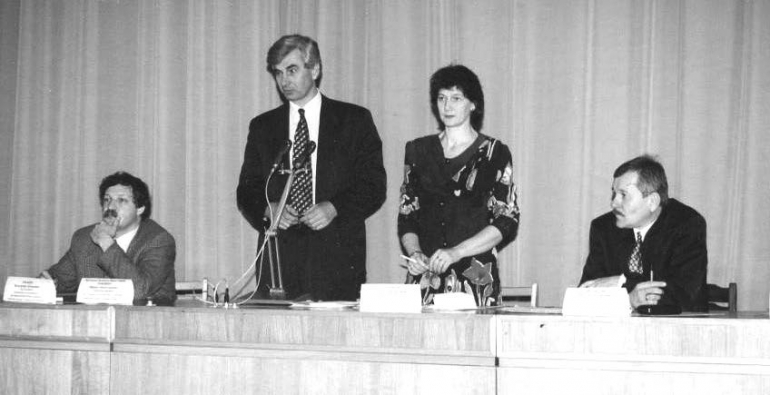 Собрание в Доме политпросвещения, 1995 год. Оргкомитет будущего Клуба бизнесменов в лице Владимира Рыжих, Олега Берлянда, Виктора Сидоренко с представителем администрации области Ириной Тишиной