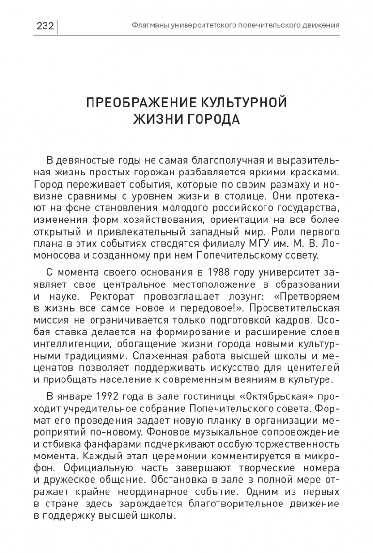 В девяностые годы не самая благополучная и выразительная жизнь простых горожан разбавляется яркими красками. Город переживает события, которые по своим размаху и новизне сравнимы с уровнем жизни в столице. Они протекают на фоне становления молодого российского государства, изменения форм хозяйствования, ориентации на все более открытый и привлекательный западный мир. Роли первого плана в этих событиях отводятся филиалу МГУ им. М. В. Ломоносова и созданному при нем Попечительскому совету.
