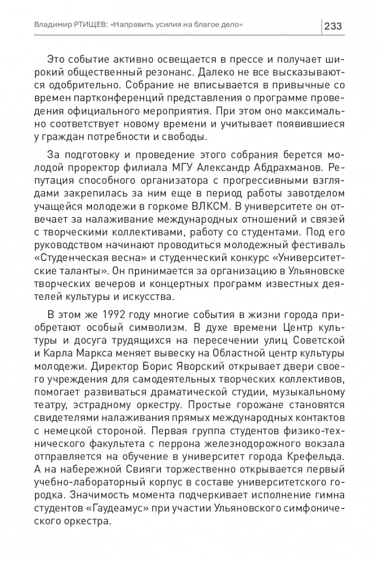 В этом же 1992 году многие события в жизни города приобретают особый символизм. В духе времени Центр культуры и досуга трудящихся на пересечении улиц Советской и Карла Маркса меняет вывеску на Областной центр культуры молодежи. Директор Борис Яворский открывает двери своего учреждения для самодеятельных творческих коллективов, помогает развиваться драматической студии, музыкальному театру, эстрадному оркестру. Простые горожане становятся свидетелями налаживания прямых международных контактов с немецкой стороной. Первая группа студентов физико-технического факультета с перрона железнодорожного вокзала отправляется на обучение в университет города Крефельда. А на набережной Свияги торжественно открывается первый учебно-лабораторный корпус в составе университетского городка. Значимость момента подчеркивает исполнение гимна студентов «Гаудеамус» при участии Ульяновского симфонического оркестра.