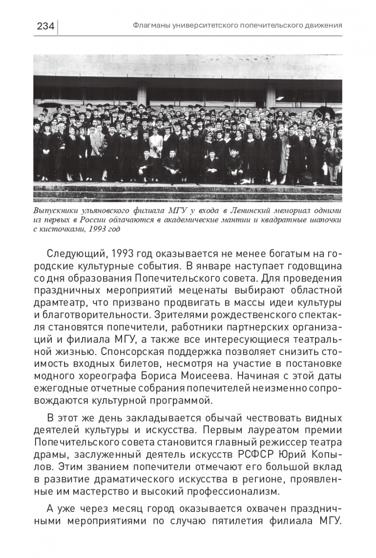Мероприятия по случаю первого выпуска студентов в июне 1993 года также выходят далеко за пределы стен университета. На открытых площадках Среднего Венца выступает симфонический оркестр, гремит молодежная дискотека, звучит праздничный салют. А выпуск студентов на главной сцене Ленинского мемориала проходит как торжественный бал. Эстафету звездного десанта на ульяновской сцене подхватывает Александр Малинин. С этого дня выпускники начинают облачаться в университетские мантии по примеру ведущих западных университетов. А опыт масштабных концертных программ ежегодно используется на университетских «Днях знаний».