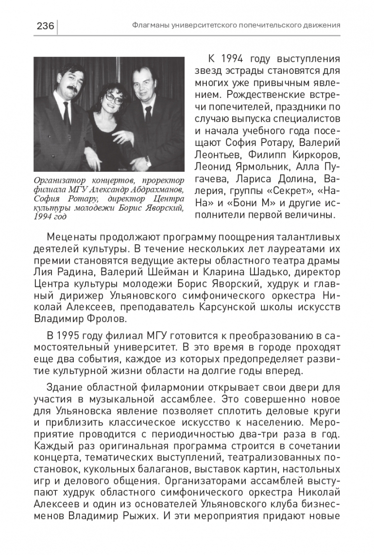 Организатор концертов, проректор филиала МГУ Александр Абдрахманов, София Ротару, директор Центракультуры молодежи Борис Яворский, 1994 год