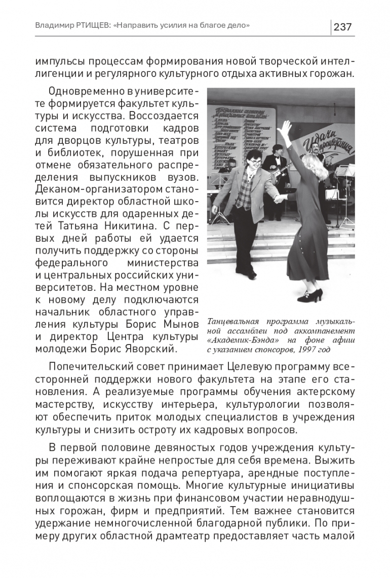 Одновременно в университете формируется факультет культуры и искусства. Воссоздается система подготовки кадров для дворцов культуры, театров и библиотек, порушенная при отмене обязательного распределения выпускников вузов. Деканом-организатором становится директор областной школы искусств для одаренных детей Татьяна Никитина. С первых дней работы ей удается получить поддержку со стороны федерального министерства и центральных российских университетов. На местном уровне к новому делу подключаются начальник областного управления культуры Борис Мынов и директор Центра культуры молодежи Борис Яворский.