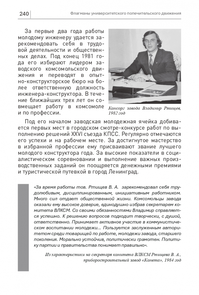 «За время работы тов. Ртищев В. А. зарекомендовал себя трудолюбивым, дисциплинированным, инициативным работником. Много сил отдает общественной жизни. Комсомольцы заводаоказали ему высокое доверие, единодушно избрав секретарем комитета ВЛКСМ. Со своими обязанностями Владимир справляется успешно. К решению вопросов подходит творчески, с душой, ответственно. Принимает активное участие в коммунистическом воспитании молодежи... Пользуется заслуженным авторитетом среди товарищей по работе, молодежи завода, старшего поколения. Морально устойчив, политически грамотен. Политику партии и правительства понимает правильно». Из характеристики на секретаря комитета ВЛКСМ Ртищева В. А.,приборостроительный завод «Комета», 1984 год