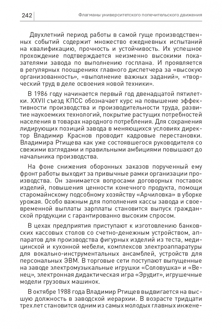 В 1986 году начинается первый год двенадцатой пятилетки. XXVII съезд КПСС обозначает курс на повышение эффективности производства и производительности труда, развитие наукоемких технологий, покрытие растущих потребностей населения в товарах народного потребления. Для сохранения лидирующих позиций завода в меняющихся условиях директор Владимир Краснов проводит кадровые перестановки. Владимира Ртищева как уже состоявшегося руководителя со свежими взглядами и правильными амбициями повышают до начальника производства.