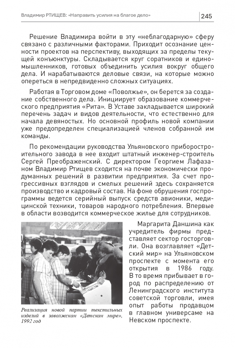 По рекомендации руководства Ульяновского приборостроительного завода в нее входит штатный инженер-строитель Сергей Преображенский. С директором Георгием Лафазаном Владимир Ртищев сходится на почве экономически продуманных решений в развитии предприятия. За счет прогрессивных взглядов и смелых решений здесь сохраняется производство и кадровый состав. На фоне обрушения госпрограммы ведется серийный выпуск средств авионики, медицинской техники, товаров народного потребления. Впервые в области возводится коммерческое жилье для сотрудников.