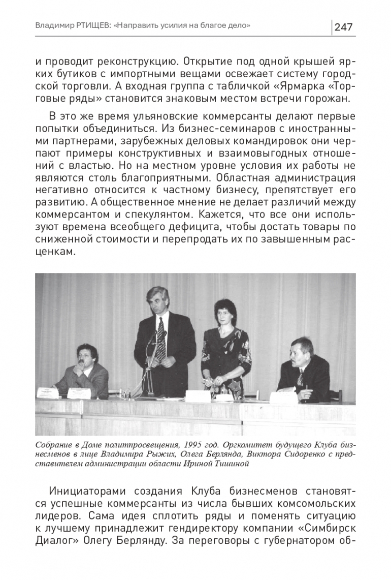 Инициаторами создания Клуба бизнесменов становятся успешные коммерсанты из числа бывших комсомольских лидеров. Сама идея сплотить ряды и поменять ситуацию к лучшему принадлежит гендиректору компании «Симбирск-Диалог» Олегу Берлянду. За переговоры с губернатором области Юрием Горячевым берутся директор Средневолжской промышленной компании Владимир Потапов и инвестор Чердаклинского сельхозпредприятия Владимир Рыжих. К предметному общению с местным бизнесом удается подключить первого заместителя губернатора Валерия Сычева. При областной администрации создается на общественных началах Комитет по развитию предпринимательства.