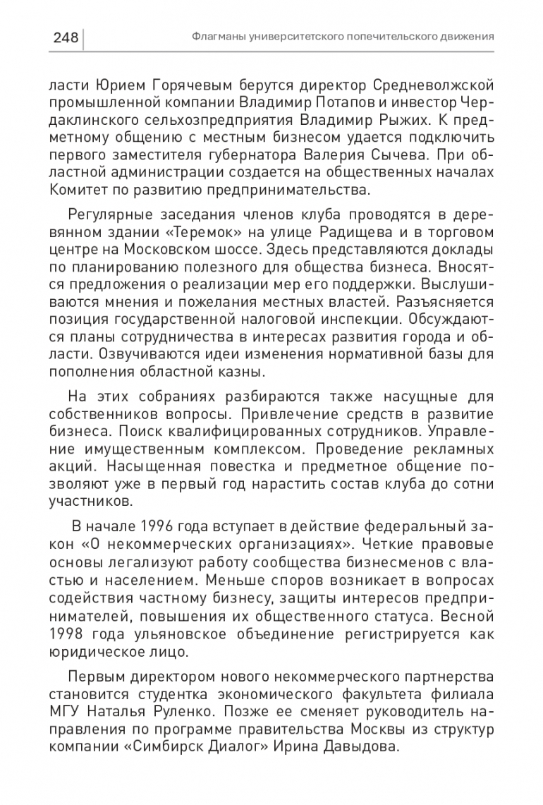В начале 1996 года вступает в действие федеральный закон «О некоммерческих организациях». Четкие правовые основы легализуют работу сообщества бизнесменов с властью и населением. Меньше споров возникает в вопросах содействия частному бизнесу, защиты интересов предпринимателей, повышения их общественного статуса. Весной 1998 года ульяновское объединение регистрируется как юридическое лицо.
