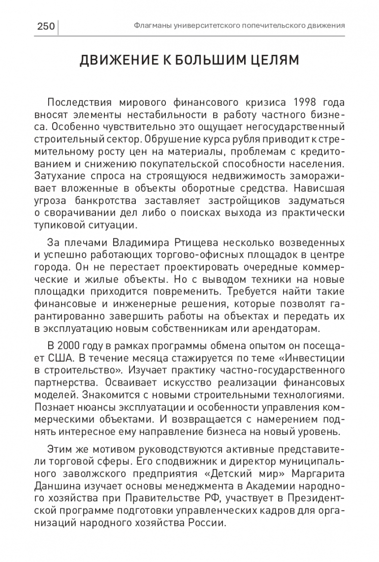 Этим же мотивом руководствуются активные представители торговой сферы. Его сподвижник и директор муниципального заволжского предприятия «Детский мир» Маргарита Даншина изучает основы менеджмента в Академии народного хозяйства при Правительстве РФ, участвует в Президентской программе подготовки управленческих кадров для организаций народного хозяйства России.