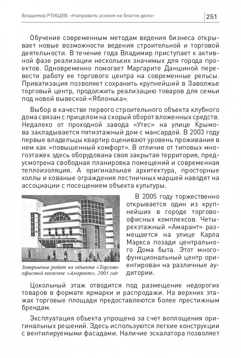 Обучение современным методам ведения бизнеса открывает новые возможности ведения строительной и торговой деятельности. В течение года Владимир приступает к активной фазе реализации нескольких значимых для города проектов. Одновременно помогает Маргарите Даншиной перевести работу ее торгового центра на современные рельсы. Приватизация позволяет сохранить крупнейший в Заволжье торговый центр, продолжить реализацию товаров для семьи под новой вывеской «Яблонька».