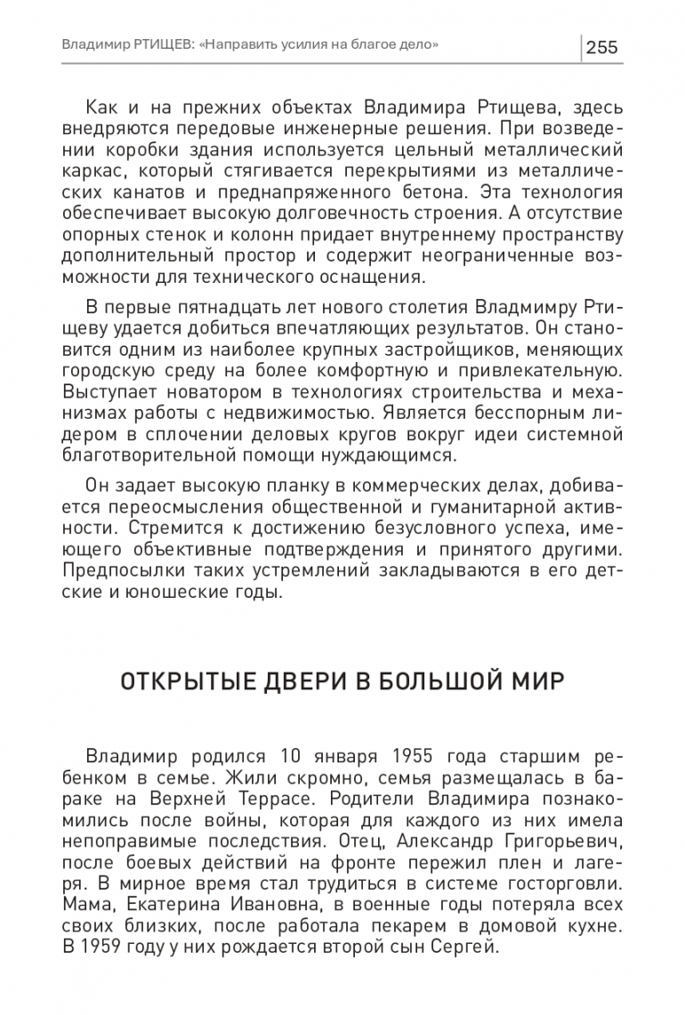 В первые пятнадцать лет нового столетия Владимиру Ртищеву удается добиться впечатляющих результатов. Он становится одним из наиболее крупных застройщиков, меняющих городскую среду на более комфортную и привлекательную. Выступает новатором в технологиях строительства и механизмах работы с недвижимостью. Является бесспорным лидером в сплочении деловых кругов вокруг идеи системной благотворительной помощи нуждающимся.