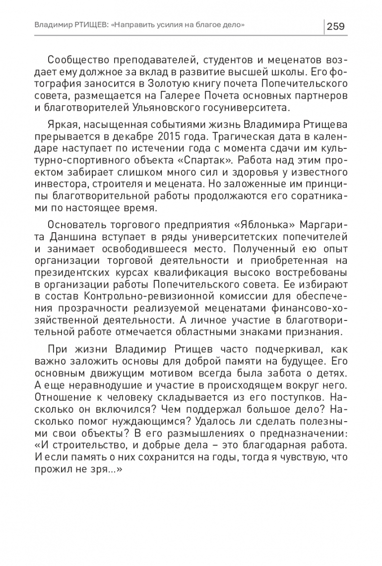 При жизни Владимир Ртищев часто подчеркивал, как важно заложить основы для доброй памяти на будущее. Его основным движущим мотивом всегда была забота о детях. А еще неравнодушие и участие в происходящем вокруг него. Отношение к человеку складывается из его поступков. Насколько он включился? Чем поддержал большое дело? Насколько помог нуждающимся? Удалось ли сделать полезными свои объекты? В его размышлениях о предназначении: «И строительство, и добрые дела — это благодарная работа. И если память о них сохранится на годы, тогда я чувствую, что прожил не зря…».