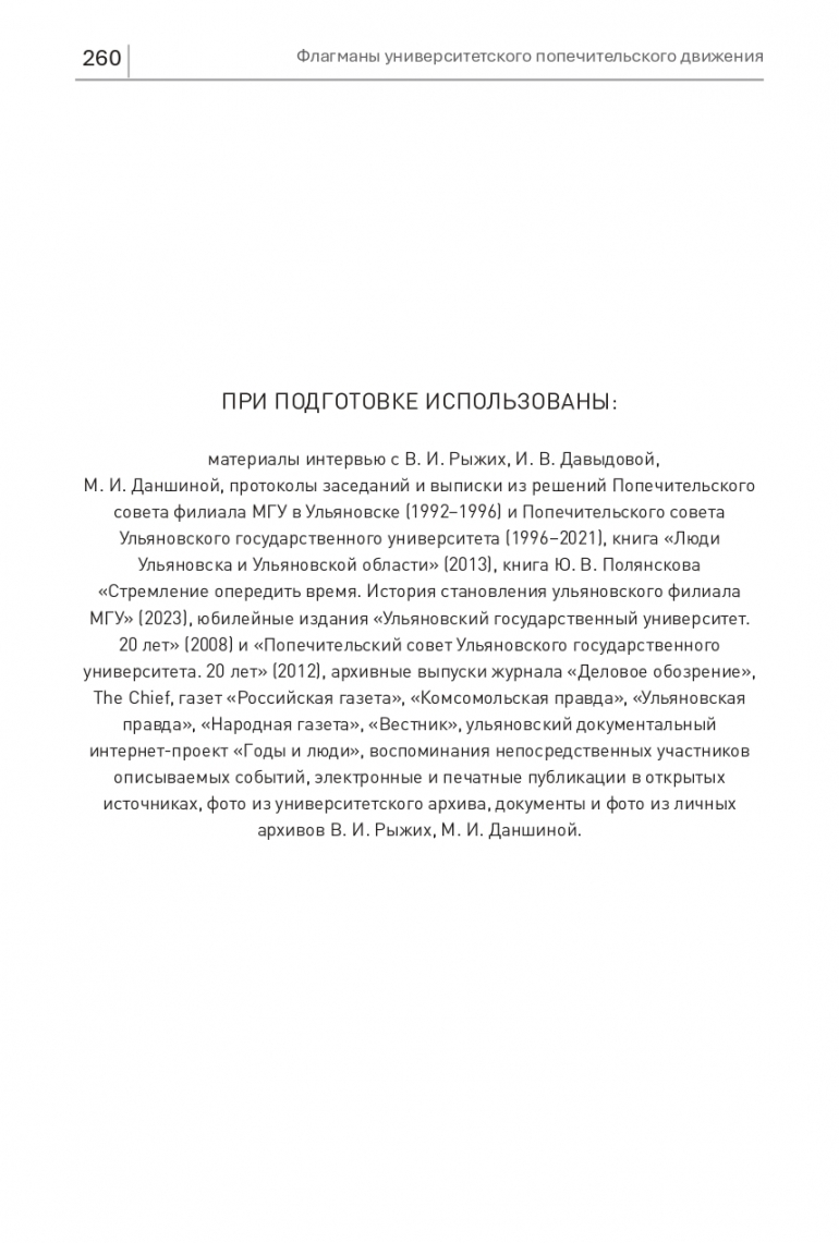 ПРИ ПОДГОТОВКЕ ИСПОЛЬЗОВАНЫ: материалы интервью с В. И. Рыжих, И. В. Давыдовой,М. И. Даншиной, протоколы заседаний и выписки из решений Попечительского совета филиала МГУ в Ульяновске (1992−1996) и Попечительского совета Ульяновского государственного университета (1996−2021), книга «Люди Ульяновска и Ульяновской области» (2013), книга Ю. В. Полянскова «Стремление опередить время. История становления ульяновского филиала МГУ» (2023), юбилейные издания «Ульяновский государственный университет. 20 лет» (2008) и «Попечительский совет Ульяновского государственного университета. 20 лет» (2012), архивные выпуски журнала «Деловое обозрение», The Chief, газет «Российская газета», «Комсомольская правда», «Ульяновская правда», «Народная газета», «Вестник», ульяновский документальный интернет-проект «Годы и люди», воспоминания непосредственных участников описываемых событий, электронные и печатные публикации в открытых источниках, фото из университетского архива, документы и фото из личных архивов В. И. Рыжих, М. И. Даншиной.