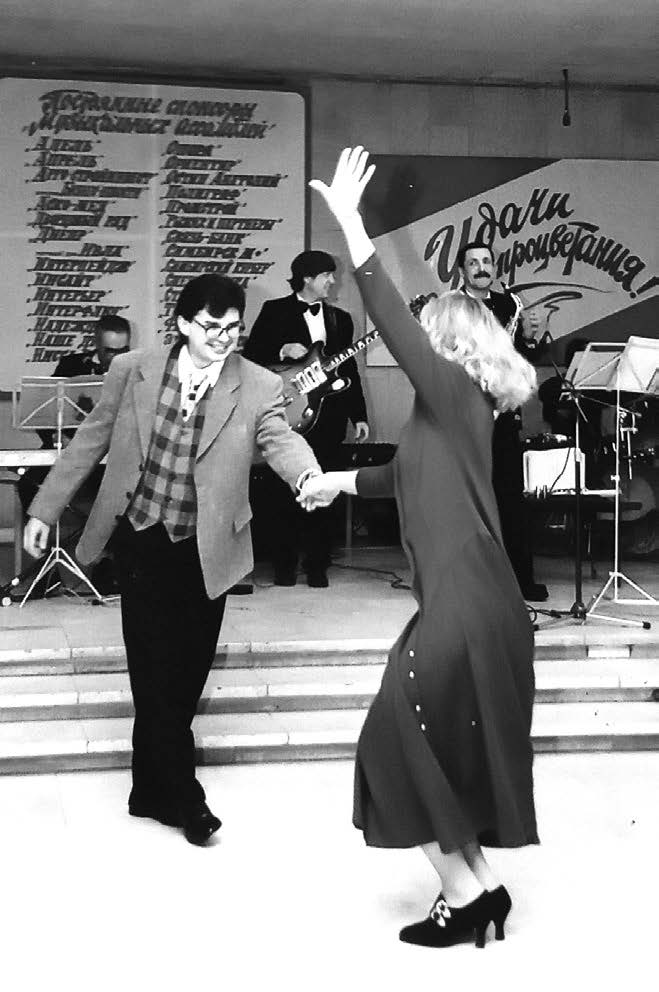 Танцевальная программа музыкальной ассамблеи под аккомпанемент «Академик-Бэнда» на фоне афиш с указанием спонсоров, 1997 год