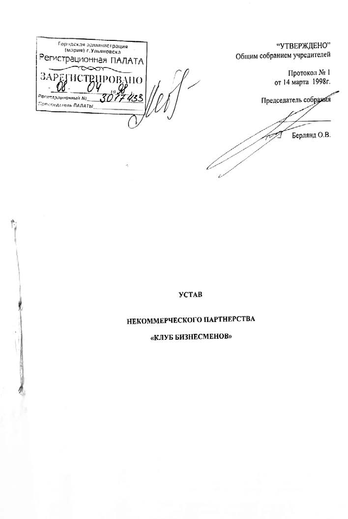 Устав некоммерческого партнерства «Клуб бизнесменов» с подписью председателя собрания О. Берлянда, 1998 год