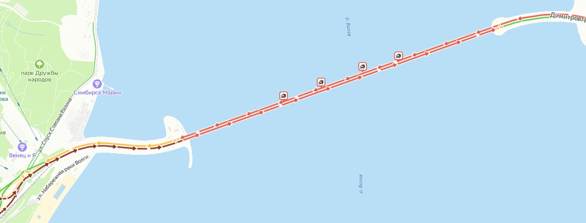 Сервис Яндекс.Карты оценивает дорожную обстановку в Ульяновске на пять баллов, но самая сложная ситуация на Императорском мосту. Движение крайне затруднено в обе стороны. По предварительной версии, пробка образовалась из-за массового ДТП. Сообщается, что одному из водителей стало плохо во время движения.