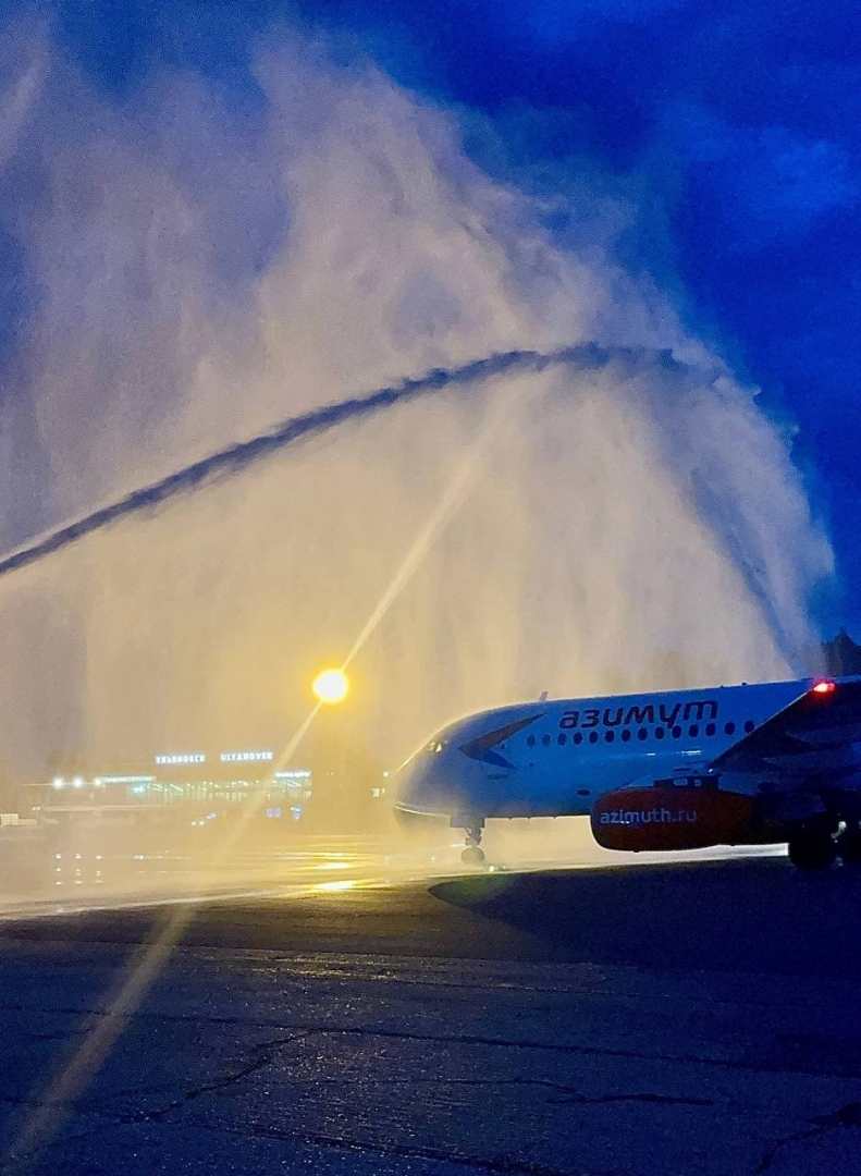 Когда воздушное судно приземлилось, его по традиции встретили водяной аркой, запущенной из пожарных автомобилей аэропорта.