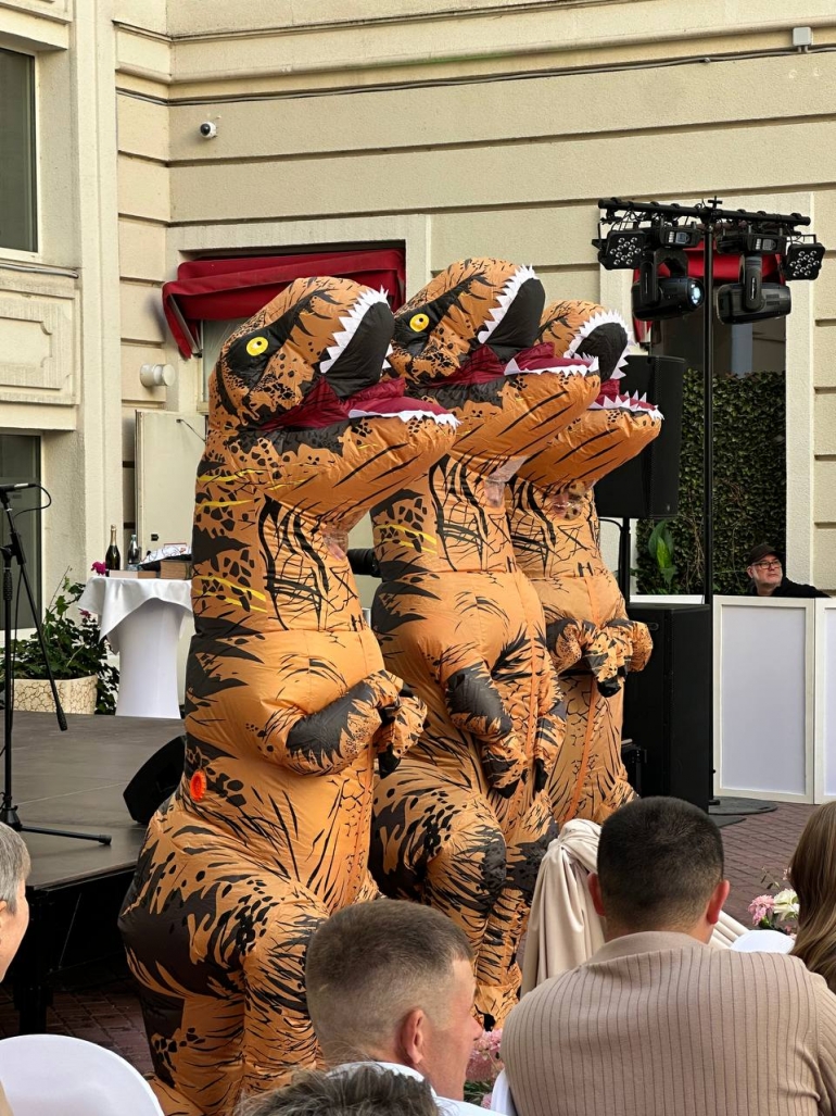 Церемония получилась очень трогательной и местами забавной. Жених Владимир появился перед гостями в сопровождении трех тирексов. Такой необычный выход придумали лучшие друзья Вовы.