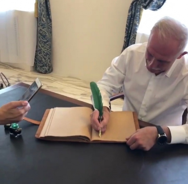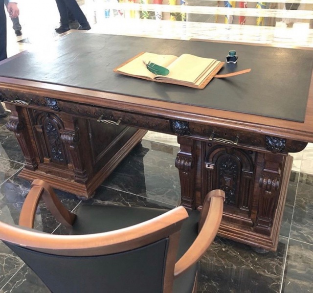 Самый необычный подарок, пожалуй, подарили предприниматели - стол, за которым работал губернатор Симбирской губернии в 1905 году. Сергей Морозов успел за него присесть и написать пожелание всему ульяновскому бизнес-сообществу перьевой ручкой и зелеными чернилами.