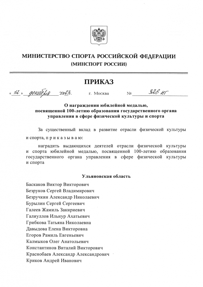 Почетный список на награждение юбилейной медалью в честь 100-летия министерства спорта РФ формировали еще при предшественнике Николая Скобелина — Рамиле Егорове. В него вошло 30 человек. Среди них Олимпийский чемпион Виталий Константинов, ветераны ульяновского спорта, руководители спортивных школ, лидеры общественных спортивных организаций. Приказ об их награждении за подписью тогдашнего министра Олега Матыцина размещен на сайте российского ведомства.