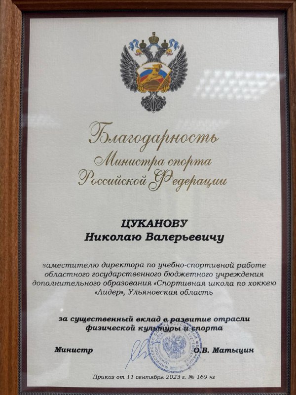 В «черном» списке без юбилейной медали и нынешний директор хоккейной «Волги» Николай Цуканов. Источники 73online.ru, рассказывают еще одну историю о том, как Скобелин по непонятным причинам целый год не вручал Цуканову отраслевую награду — Благодарность минспорта РФ. Она пришла в областное минспорта еще в сентябре 2023 года. По регламенту ее должны были вручить не позднее чем через 6 месяцев после подписания приказа. Однако Цуканов забирал грамоту лично из наградного отдела осенью 2024 года, так и не дождался официальной церемонии.