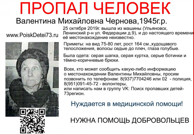 Вчера, 26 октября, волонтеры обошли центральные улицы Ульяновска в поисках пропавшей пенсионерки Валентины Черновой, однако женщину так и не нашли.
