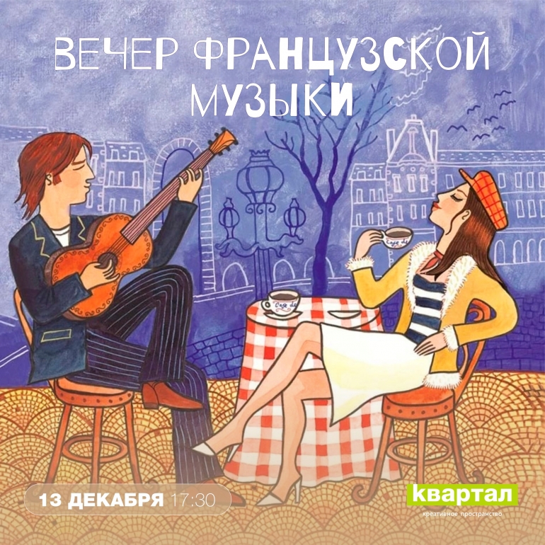 13 декабря в 17.30 в креативном пространстве «Квартал» (ул. Ленина, 78). Мари Клэр Жоржи исполнит песни на французском языке, расскажет о французской музыке и о национальных танцах.