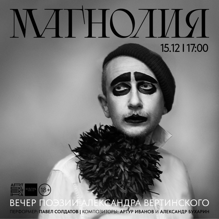 15 декабря в 17.00 в баре «Культура» (ул. Дворцовая, 8) состоится вечер поэзии Александра Вертинского. Павел Солдатов устроит иммерсивную перформанс-читку стихотворений Александра Вертинского под нойз/шугейз музыку Артура Иванова и Александра Бухарина. Вход — свободные взносы. Регистрация здесь.