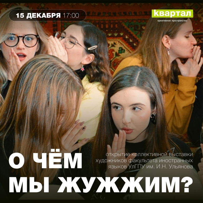 15 декабря в 17.00 в креативном пространстве «Квартал» (ул. Ленина, 78) художники факультета иностранных языков «УлГПУ им. И. Н. Ульянова» приглашают на открытие второй своей зимней выставки «О чём мы жужжим?». Работа каждого автора отражает и личные душевные волнения, и более масштабные переживания, которые смогут тронуть даже самого серьёзного критика. Вход — свободный.