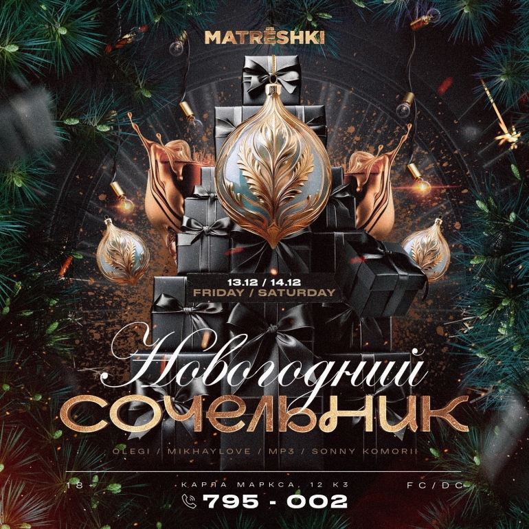 13 и 14 декабря (ул. Карла Маркса, 12, к. 3) в преддверии марафона новогодних вечеринок пройдет всеобщий городской корпоратив. В программе: новогодняя фотозона и праздничный декор, аниматоры, новогодние предсказания от таролога, Дед Мороз и Снегурочка, конкурсы и розыгрыш подарков. Начало в 22.00.