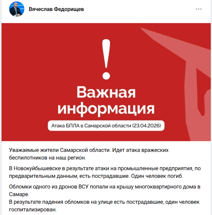 — В Новокуйбышевске в результате атаки на промышленные предприятия, по предварительным данным, есть пострадавшие. Один человек погиб. Обломки одного из дронов ВСУ попали на крышу многоквартирного дома в Самаре. В результате падения обломков на улице есть пострадавшие, один человек госпитализирован. Развернут оперативный штаб. Экстренные службы приступили к работе.