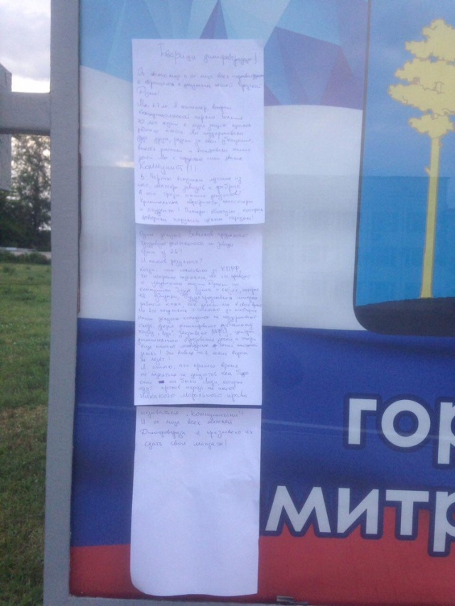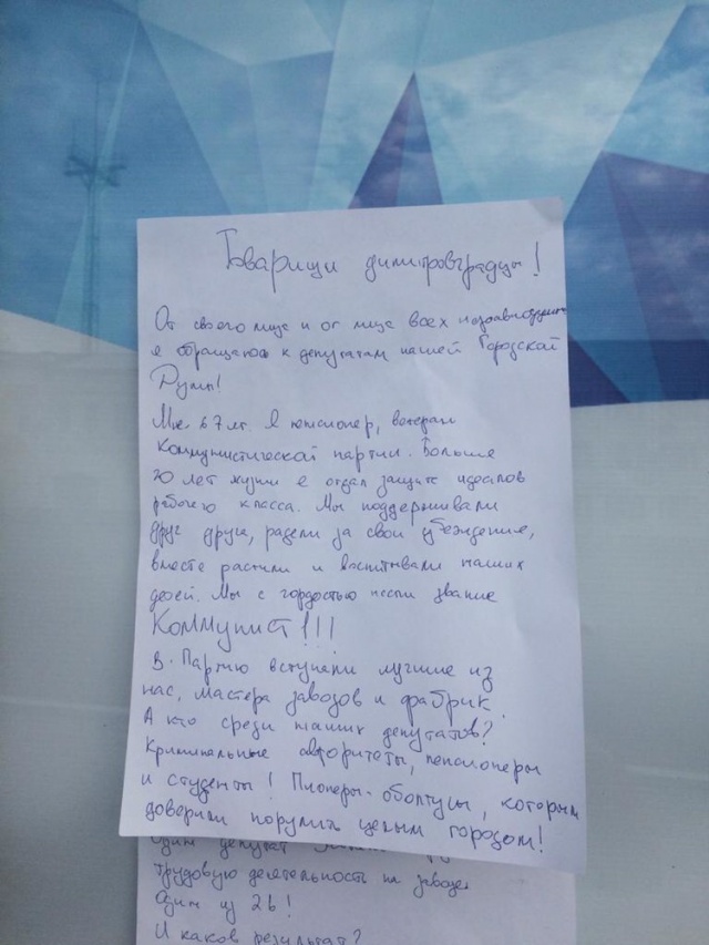 В Димитровграде неизвестный 67-летний коммунист призвал депутатов городской думы одуматься и сдать мандаты. Соответствующее письмо неназванный герой приклеил к доске почета у городской мэрии.