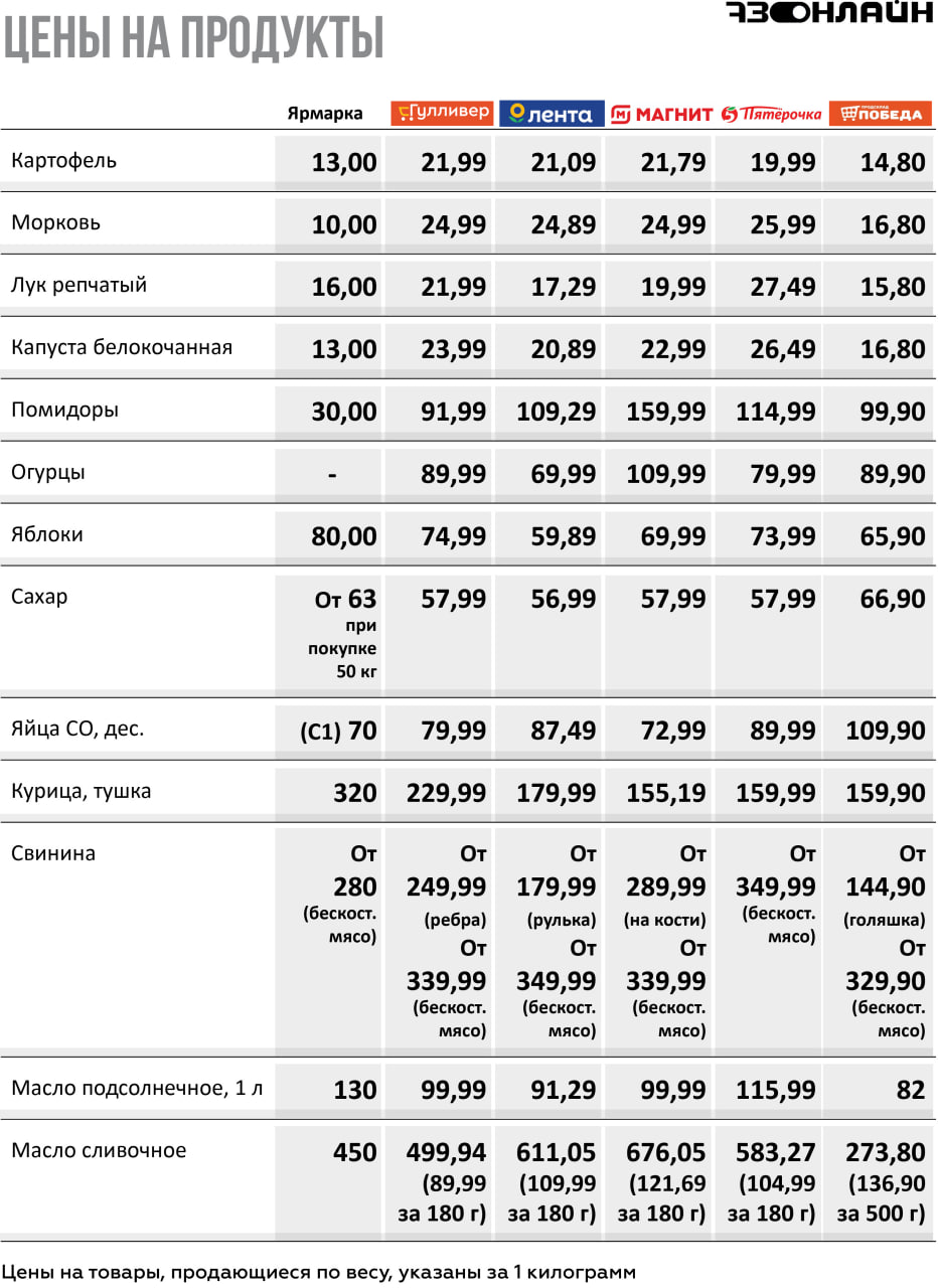 Поскольку ярмарка проходит в Заволжье, в этот раз в «Ашан» мы не заглянули – зато наведались в «Ленту», которая к проспекту Ульяновскому на порядок ближе. Цены брали наиболее низкие из представленных, а стоимость сливочного масла (не менее 72,5% жирности!) пересчитали на килограмм для удобства. В скобках указали цену и вес пачки из магазина.