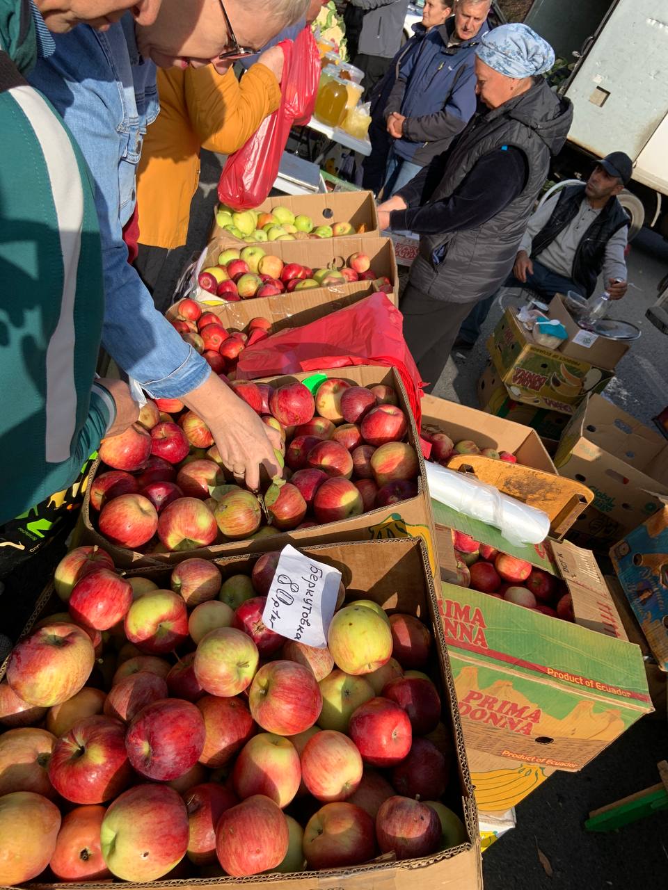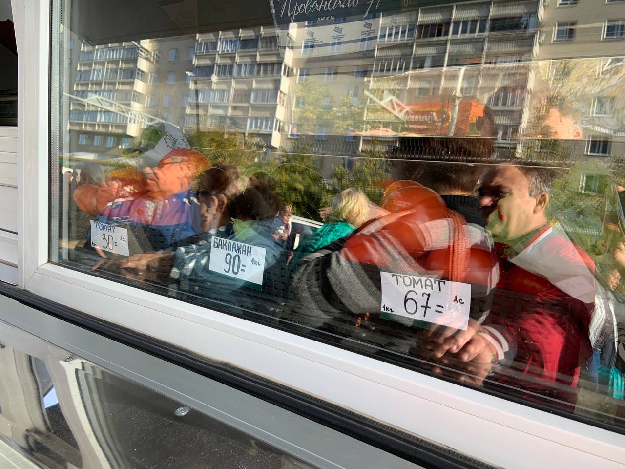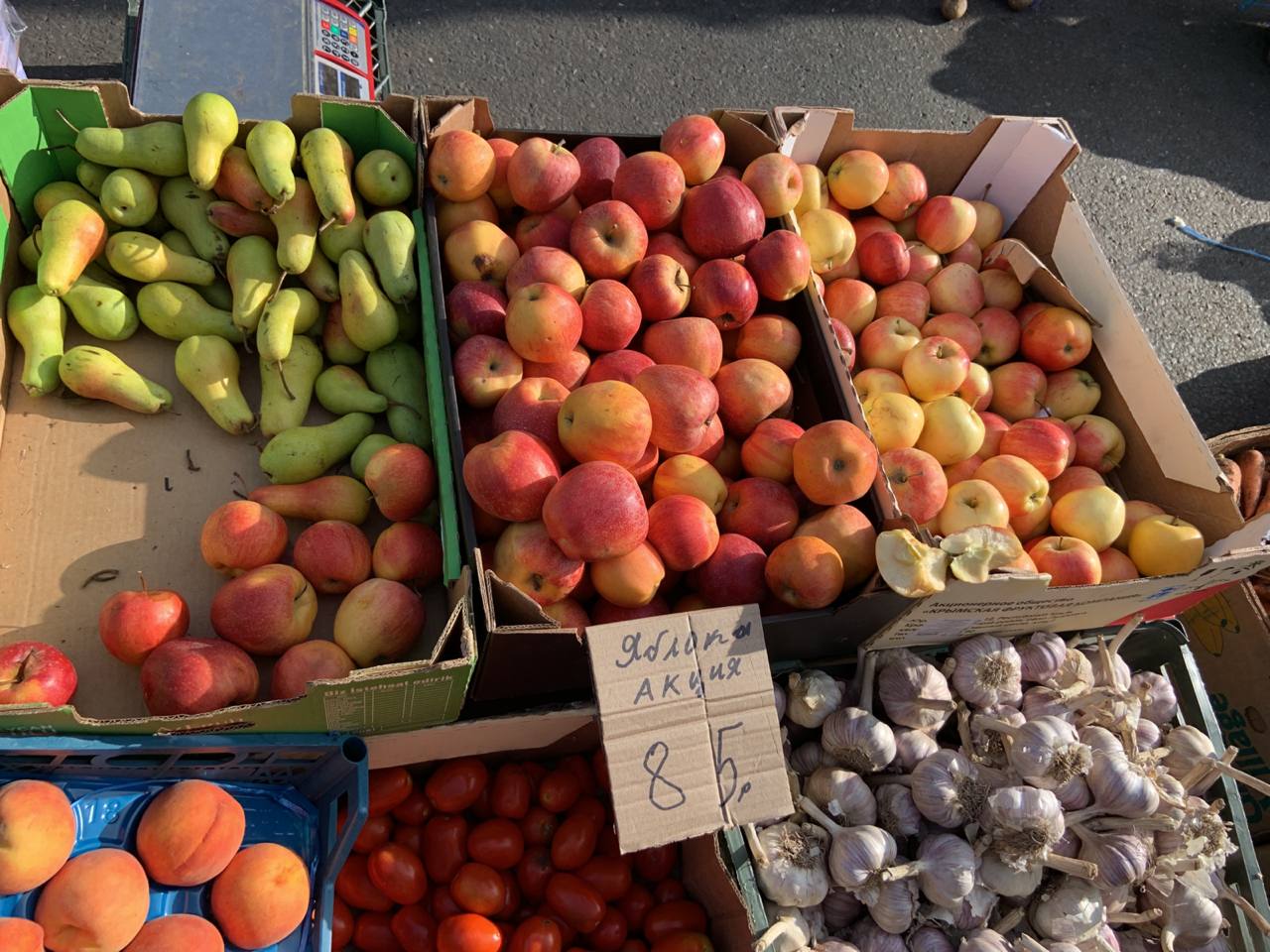 «А ты сейчас дешевле нигде не найдёшь», — говорит одна бабулечка другой. В лотке лежат яблоки за 80 рублей/кг. Вообще старшее поколение знает толк в «дарах осени» (таблички с такими названиями размещены везде, на всех сетках и мешках с овощами и фруктами):