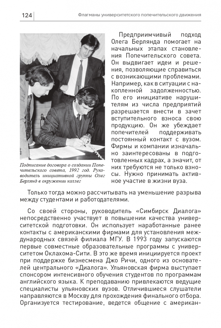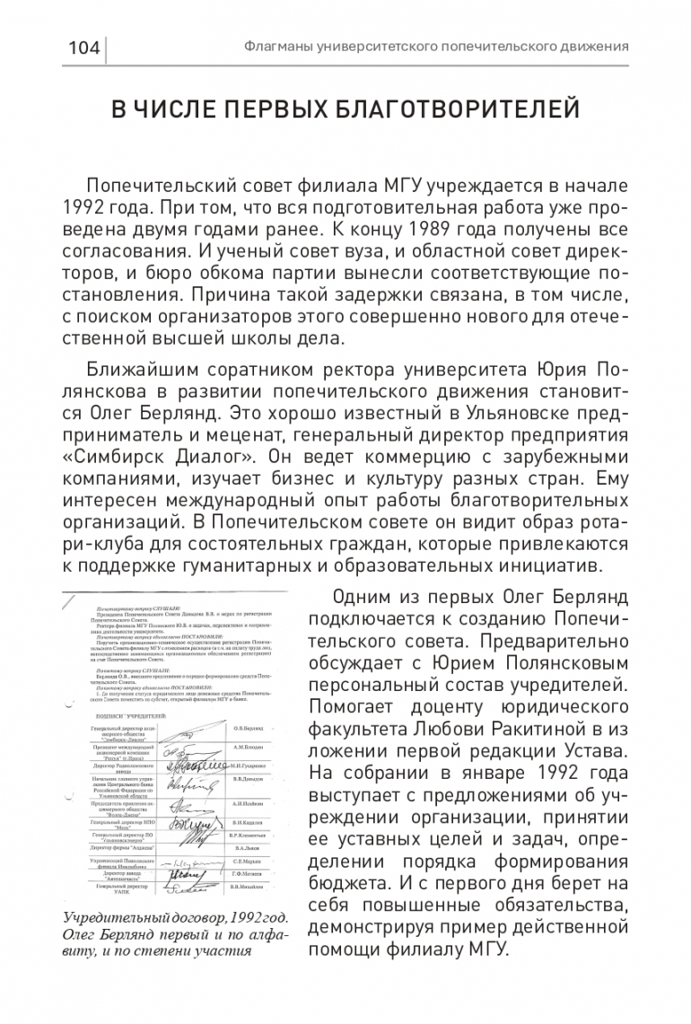 Подписи под договором об учреждении Попечительского совета ставят двадцать шесть человек. Каждый из них обозначает размер посильного финансового вклада в новое дело. Вступительный взнос Берлянда становится одним из самых существенных. Более крупные вклады делают только руководители крупнейших предприятий. Среди них генеральный директор Ульяновского авиапромышленного комплекса Виктор Михайлов и руководитель радиолампового завода Михаил Гусаренко.