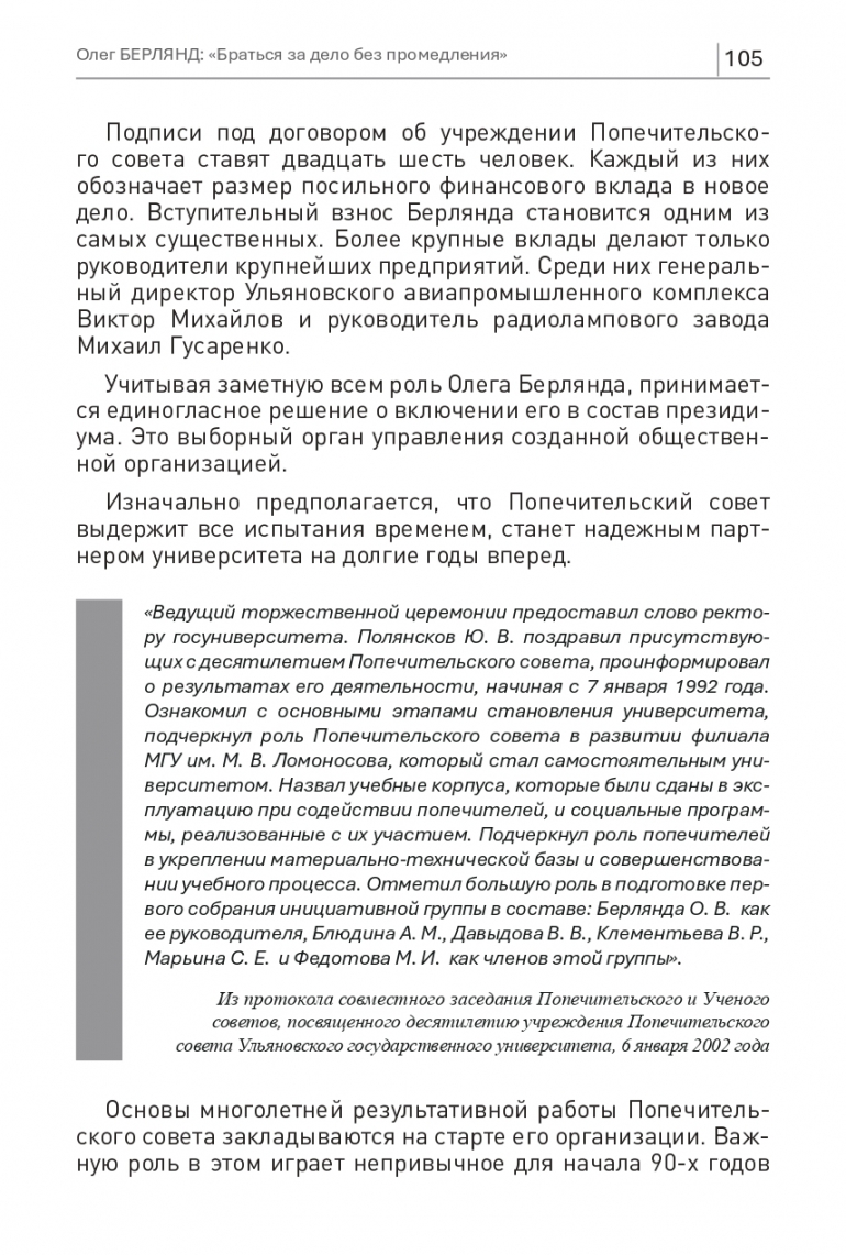«Ведущий торжественной церемонии предоставил слово ректору госуниверситета. Полянсков Ю. В. поздравил присутствующих с десятилетием Попечительского совета, проинформировал о результатах его деятельности, начиная с 7 января 1992 года. Ознакомил с основными этапами становления университета, подчеркнул роль Попечительского совета в развитии филиала МГУ им. М. В. Ломоносова, который стал самостоятельным университетом. Назвал учебные корпуса, которые были сданы в эксплуатацию при содействии попечителей, и социальные программы, реализованные с их участием. Подчеркнул роль попечителей в укреплении материально-технической базы и совершенствовании учебного процесса. Отметил большую роль в подготовке первого собрания инициативной группы в составе: Берлянда О. В. как ее руководителя, Блюдина А. М., Давыдова В. В., Клементьева В. Р., Марьина С. Е. и Федотова М. И. как членов этой группы». Из протокола совместного заседания Попечительского и Ученого советов, посвященного десятилетию учреждения Попечительского совета Ульяновского государственного университета, 6 января 2002 года