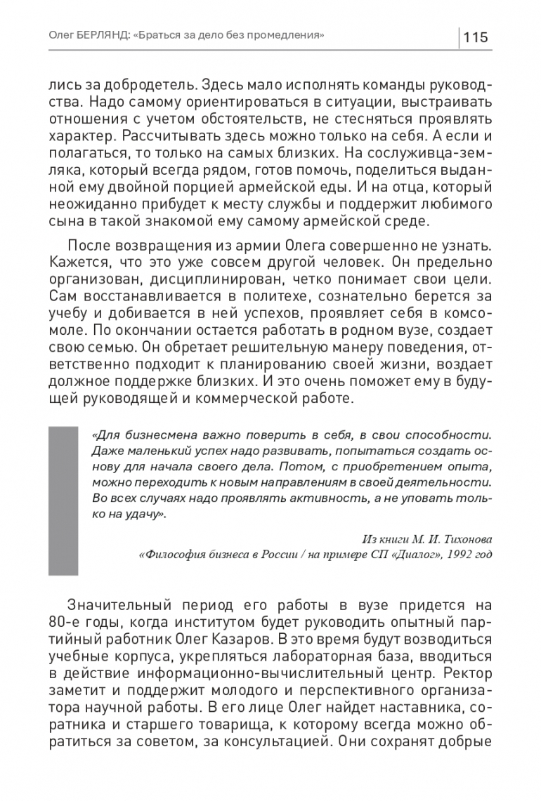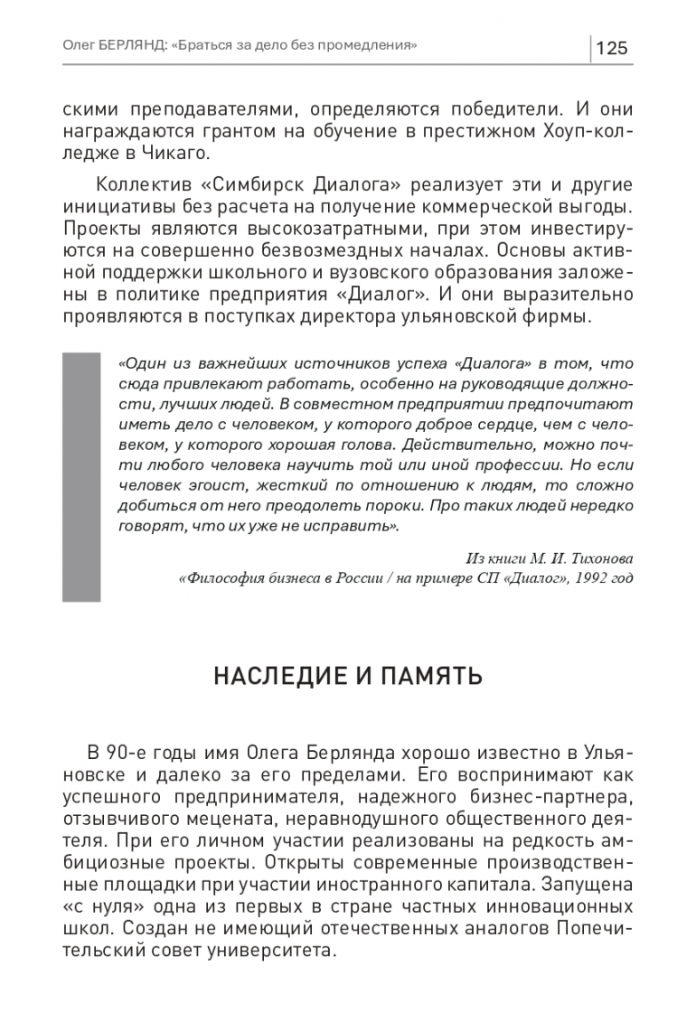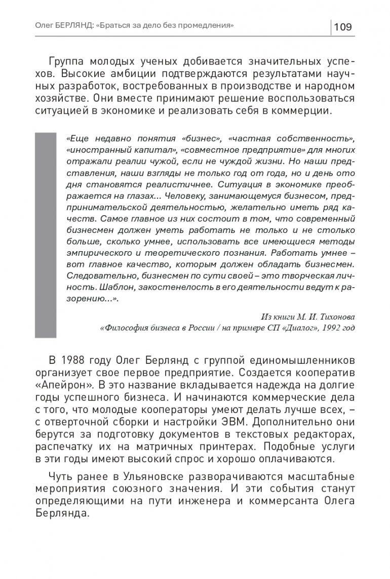 «Еще недавно понятия «бизнес», «частная собственность», «иностранный капитал», «совместное предприятие» для многих отражали реалии чужой, если не чуждой жизни. Но наши представления, наши взгляды не только год от года, но и день ото дня становятся реалистичнее. Ситуация в экономике преображается на глазах… Человеку, занимающемуся бизнесом, предпринимательской деятельностью, желательно иметь ряд качеств. Самое главное из них состоит в том, что современный бизнесмен должен уметь работать не только и не столько больше, сколько умнее, использовать все имеющиеся методы эмпирического и теоретического познания. Работать умнее – вот главное качество, которым должен обладать бизнесмен. Следовательно, бизнесмен по сути своей – это творческая личность. Шаблон, закостенелость в его деятельности ведут к разорению...». Из книги М. И. Тихонова «Философия бизнеса в России / на примере СП «Диалог», 1992 год
