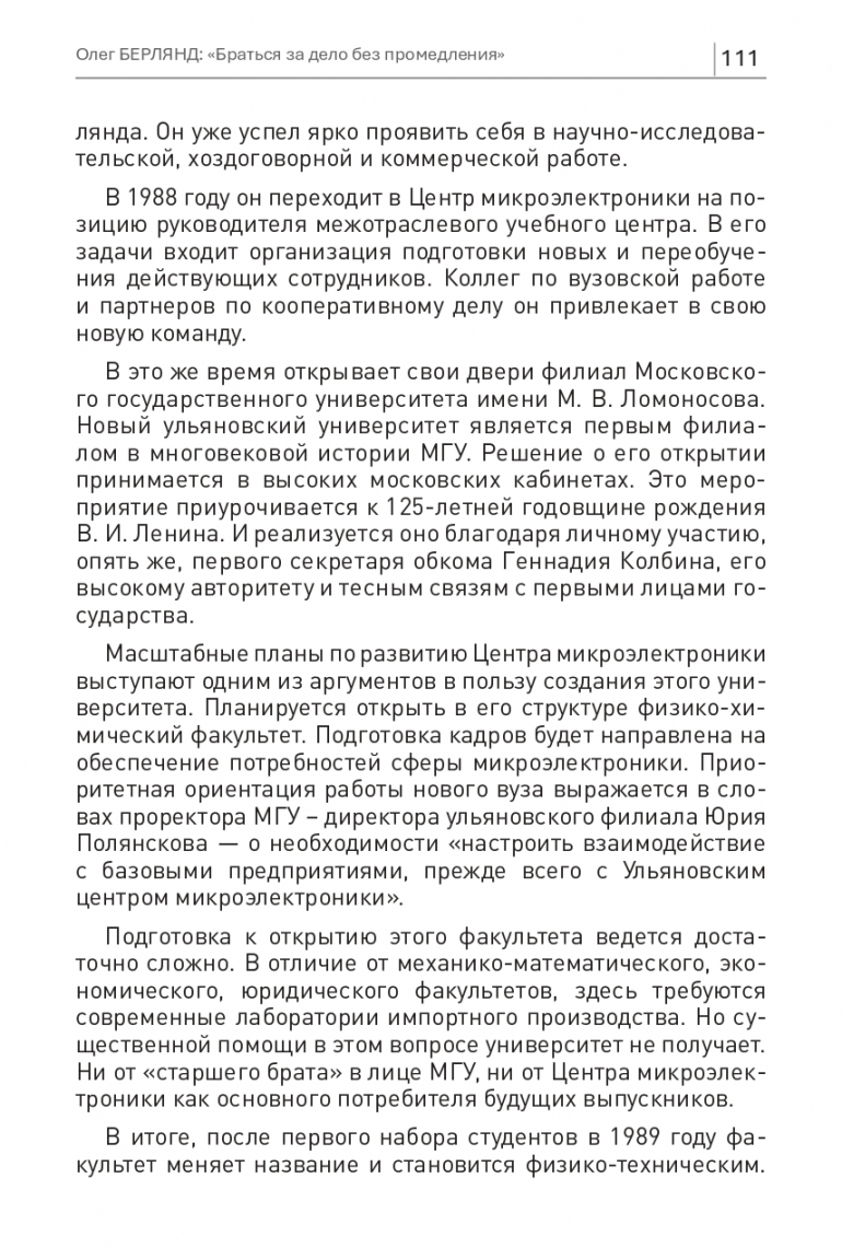 На новом участке работы в Ульяновском центре микроэлектроники Олег Берлянд включается в регулярное взаимодействие с руководством филиала МГУ. И возглавляемый им учебный центр, и физико-технический факультет в университете работают над решением общей задачи. Необходимо обеспечить передовые научно-производственные площадки квалифицированными исследователями и инженерами.