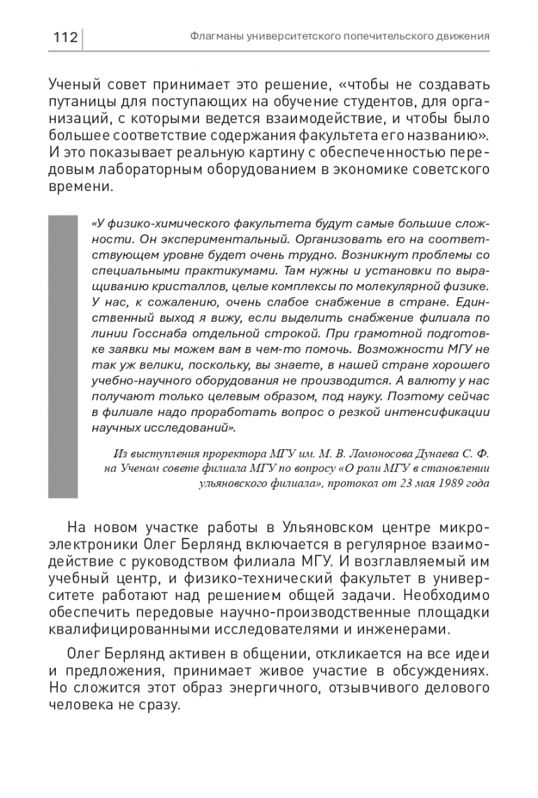 «У физико-химического факультета будут самые большие сложности. Он экспериментальный. Организовать его на соответствующем уровне будет очень трудно. Возникнут проблемы со специальными практикумами. Там нужны и установки по выращиванию кристаллов, целые комплексы по молекулярной физике. У нас, к сожалению, очень слабое снабжение в стране. Единственный выход я вижу, если выделить снабжение филиала по линии Госснаба отдельной строкой. При грамотной подготовке заявки мы можем вам в чем-то помочь. Возможности МГУ не так уж велики, поскольку, вы знаете, в нашей стране хорошего учебно-научного оборудования не производится. А валюту у нас получают только целевым образом, под науку. Поэтому сейчас в филиале надо проработать вопрос о резкой интенсификации научных исследований».Из выступления проректора МГУ им. М. В. Ломоносова Дунаева С. Ф. на Ученом совете филиала МГУ по вопросу «О роли МГУ в становлении ульяновского филиала», протокол от 23 мая 1989 года